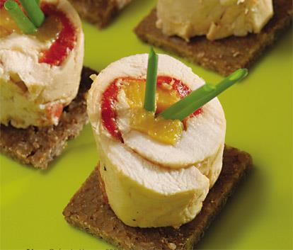 - Corta bases de Pumpernickel, y sitúa los cilindros de pollo con pimentón y duraznos en el centro.